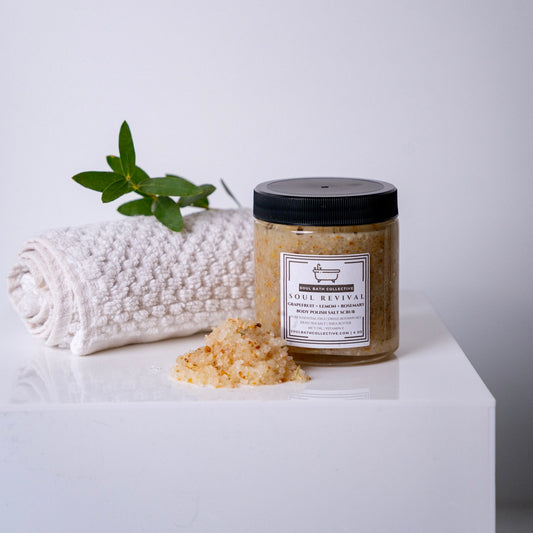 Body Polish Salt Scrub, Soul Revival, Grapefruit Lemon Rosemary, Dead Sea Salt, Shea Butter, MCT Oil, Essential Oils