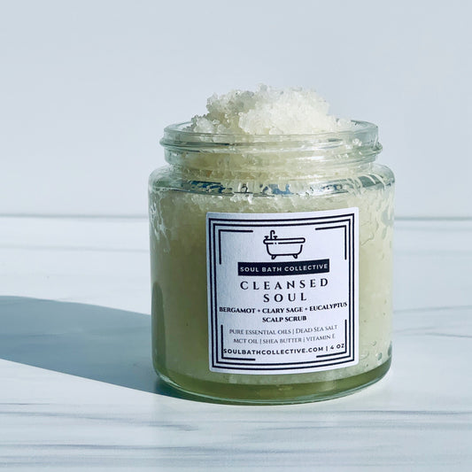 Scalp Scrub, Cleansed Soul: Bergamot, Clary Sage, Eucalyptus, Dead Sea Salt, MCT Oil, Shea Butter, 4 oz Eco-Friendly Glass Jar