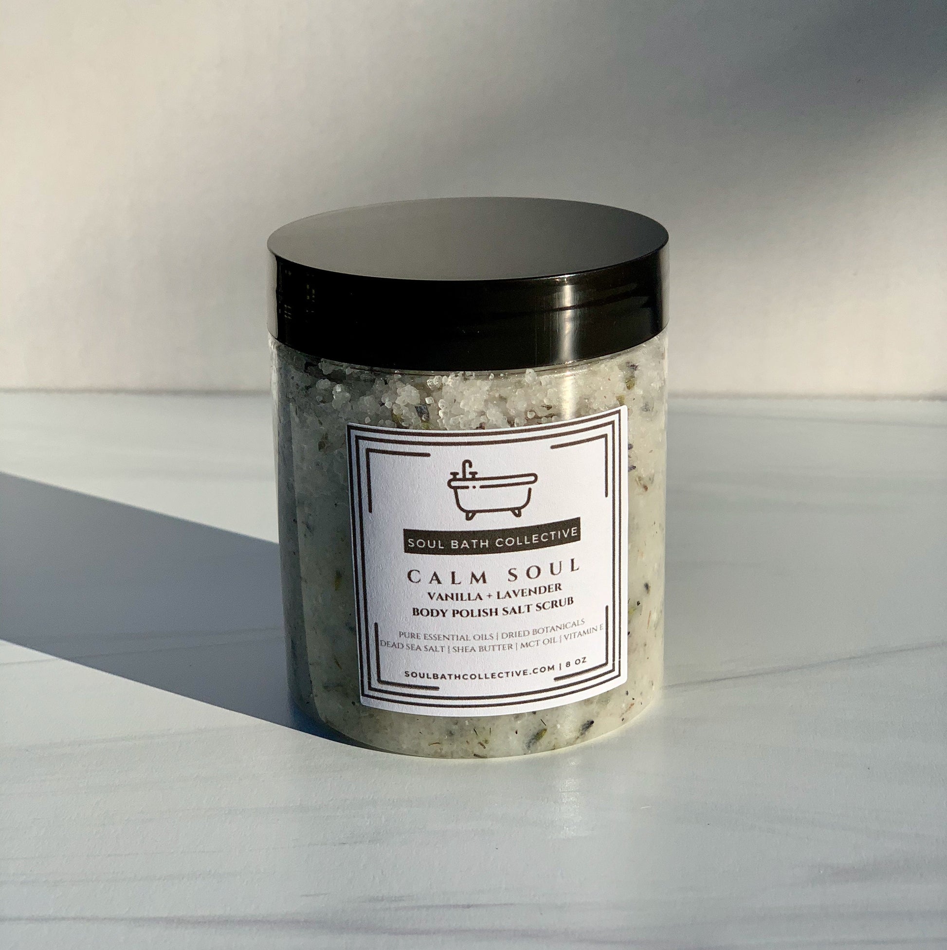 Body Polish Salt Scrub, Vanilla Lavender, Calm Soul, Dead Sea Salt, MCT Oil, Shea Butter, Essential Oils, Dried Botanicals