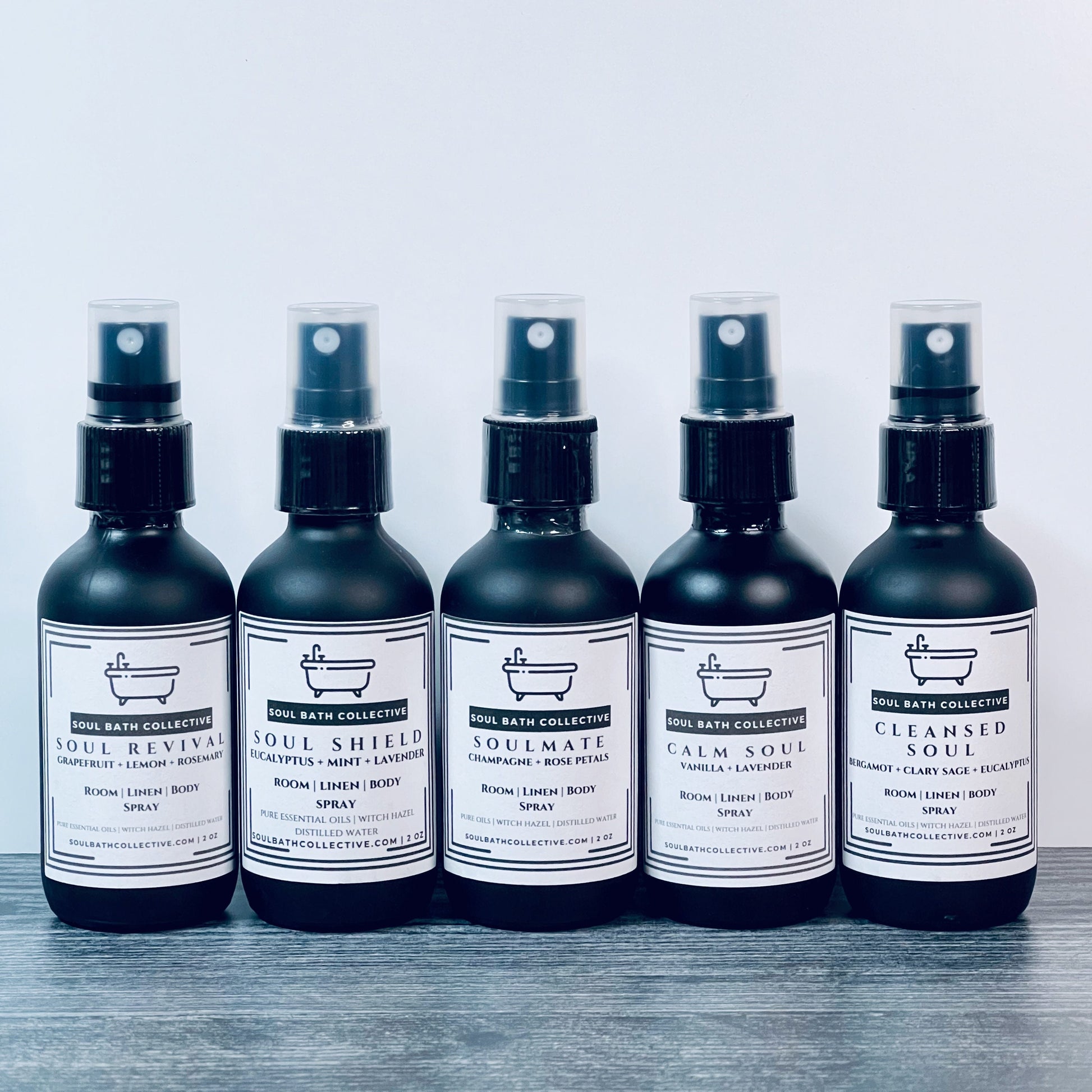 These room, linen/pillow, and body sprays are made with Witch Hazel, Distilled Water, and Essential Oils. Each eco-friendly glass spray bottle holds 1 ounce.